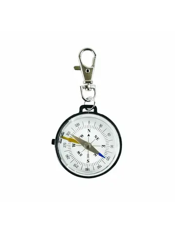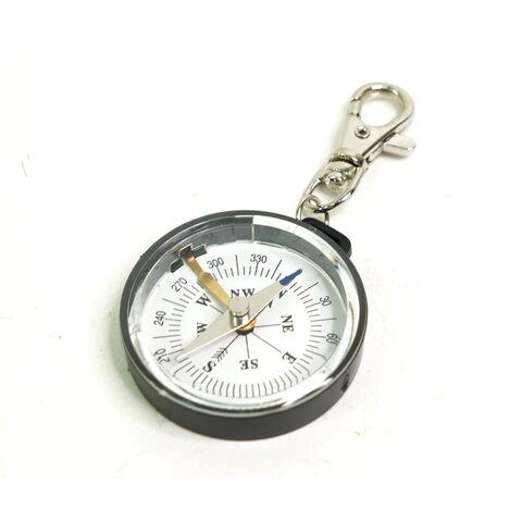 Туристический компас с карабином и фиксатором стрелки, круглая капсула выполнена из пластмассы.